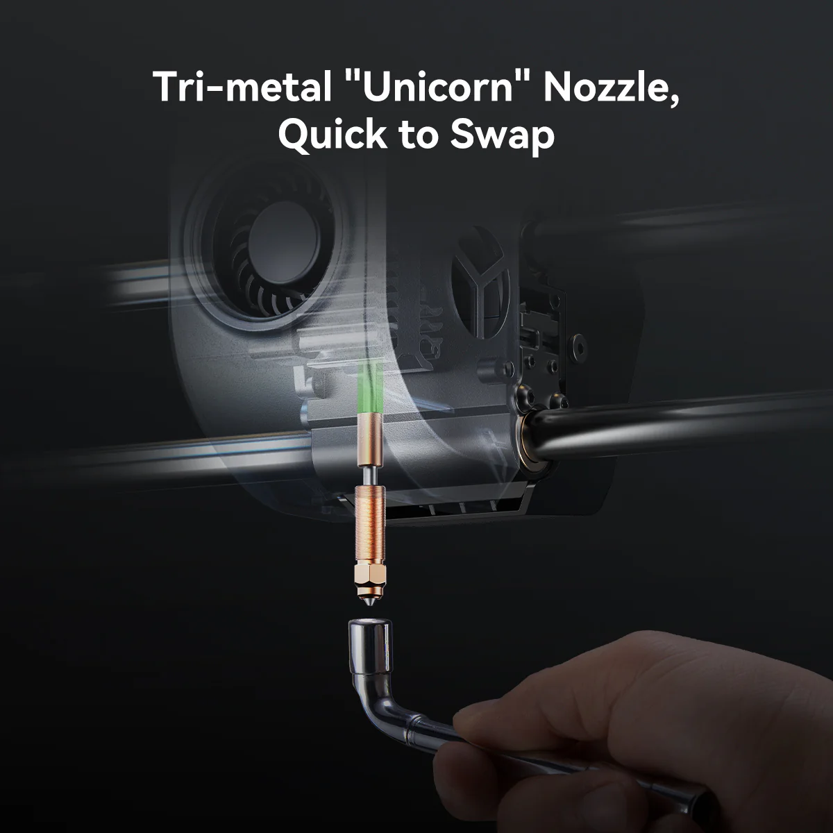 The hotend is powered by a 60W ceramic heater that fully melts high-temp filaments in seconds. It features the tri-metal “Unicorn” nozzle—a masterfully engineered component combining a hardened steel tip for durability, a copper body for heat dissipation, and a titanium alloy heatbreak to prevent heat creep.